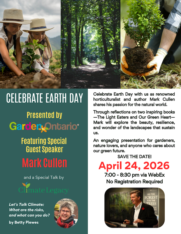 On Friday, April 24th, Climate Legacy and the Ontario Horticultural Association are presenting an Earth Day celebration that brings together two powerful voices for our planet, Mark Cullen and Climate Legacy’s own Betty Plewes. Beginning at 7:00pm ET, this will be an evening of inspiration, reflection, and action.