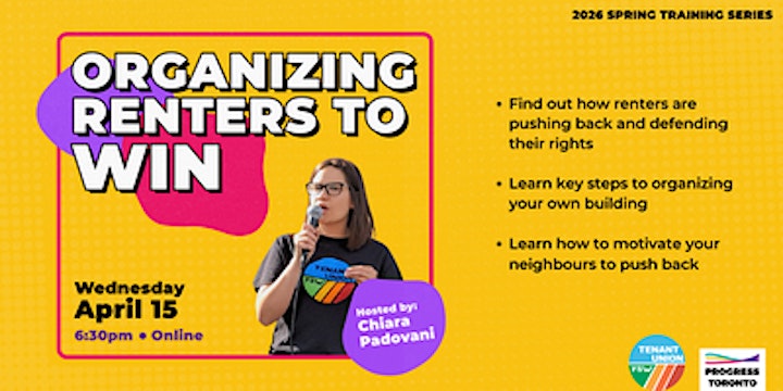 Come learn from Chiara on Wednesday, April 15 at 6:30PM. She will be sharing her experiences, the power of bringing neighbours together, and how you can get involved in organizing renters to win.
