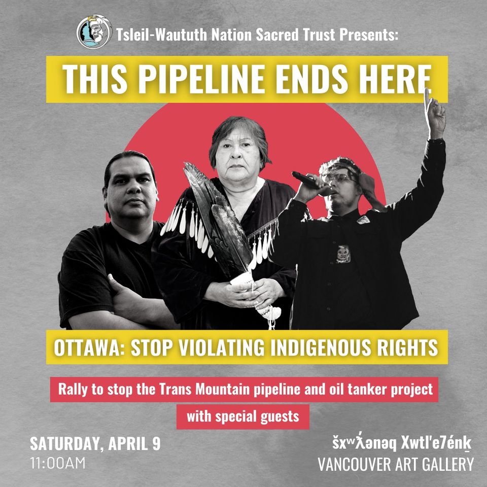 Please join the Tsleil-Waututh Nation Sacred Trust Initiative and its allies for a rally against the Trans Mountain pipeline expansion featuring Indigenous leaders from across North America. Now that construction costs have soared past $21.4 billion, the federal government has ruled out more public financing and is looking for new investors. Together, we will show them that the Indigenous-led movement to stop Trans Mountain is stronger and more determined than ever.